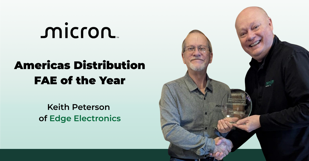 Keith Peterson, Field Application Engineer at Edge Electronics, exemplifies that belief, and Micron Americas agrees: Keith has been named the recipient of Micron Americas Distribution FAE of the Year Award for excellent technical support, and we couldn't be more proud.